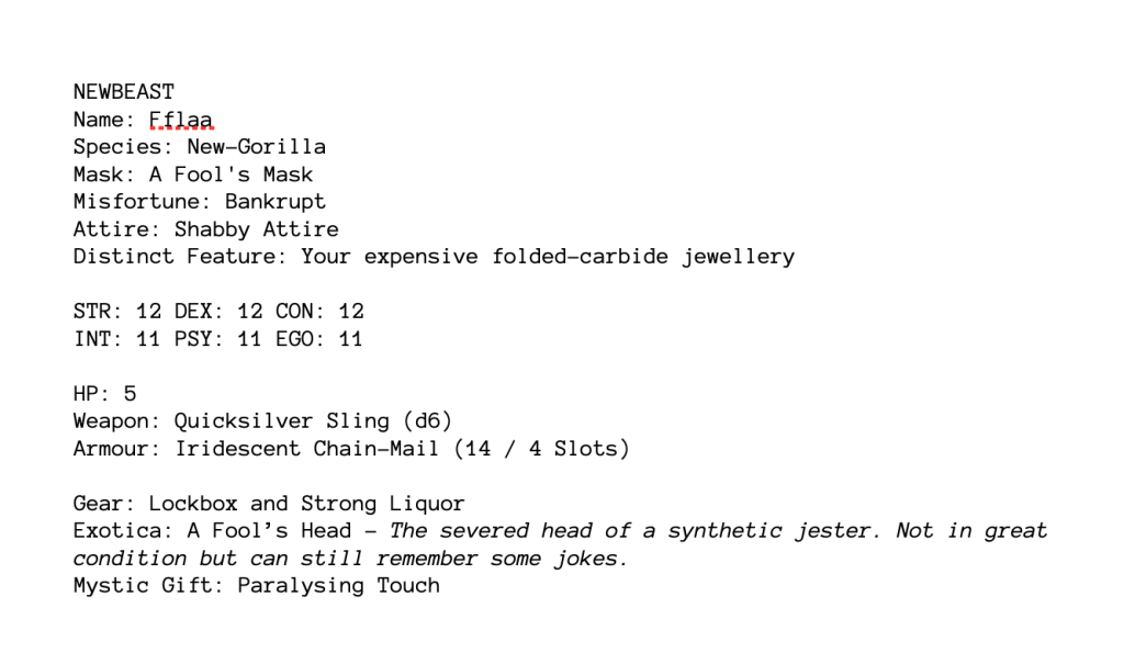I like this already. Fflaa seems like they’ve bankrupted themselves to pay for all that folded-carbide jewellery. The image of a hulking sapient gorilla wearing a jester mask appeals to me as well on some primal level. Is there a connection between the fool mask and the severed fool’s head? There has to be. Anyway, let’s see who’s next up for our party: