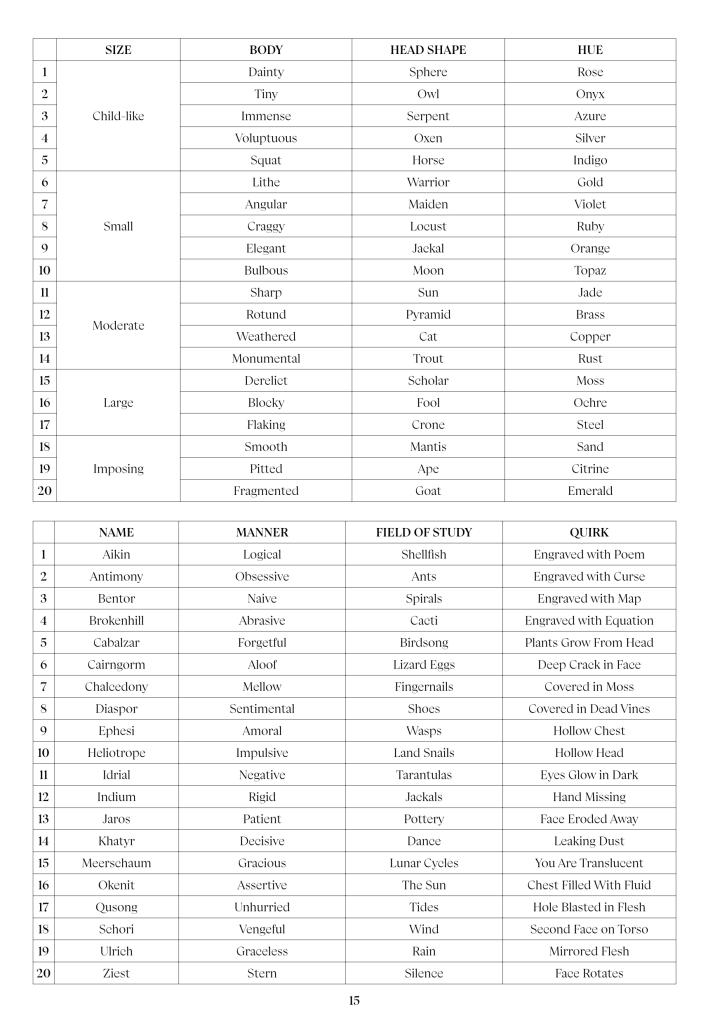 Their life cycle is as strange as their bodies. Lithlings are grown from a seed, which must crystallise and grow in a pool of special chemicals. After decades of maturation in this bath, they are fully-moulded and awaken, as large and strong as they will ever be. They are inducted into the Lithic Lyceum by their kindred, and instructed in their duties as scholars.