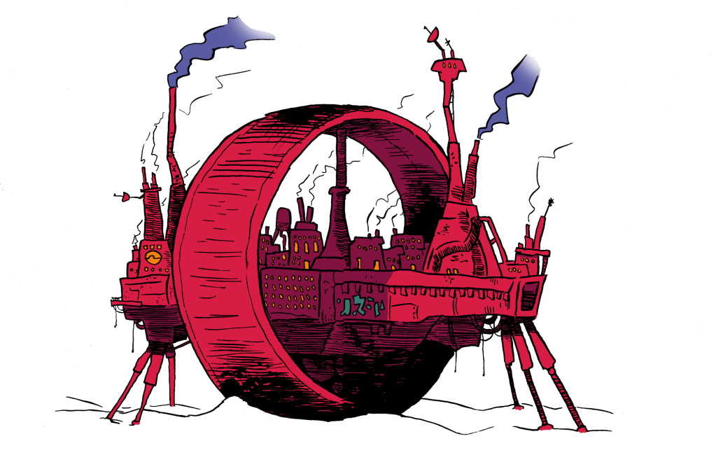 Caeba in the Maw is an adventure location presented in poster format. Your players can explore the trundle-town of Caeba, a roughneck scavenger suburb that roams the blue desert inside a great iron wheel. The PCs can also delve into the ossifying Corpse of the Grandfather – the carcass of a millennia-old sandworm, its four stomachs surely filled with secrets. Published as a double-sided A3 poster, in full colour on uncoated paper.