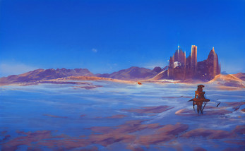 ‘The Tower of Eno is an inverted tower set inside a rock formation deep within the center of the blue desert. Time and the shifting sands submerged the formation long ago. At one time the rock formation that was selected to house the inverted tower stood imposing over the sands below, casting a day’s long shadow across the interior. The entrance was strategically placed at the peak, meaning visitors were required to make either a week long pilgrimage up the rock face or travel via air direct to the summit. It is only now, as a result of the Zuaar mega storm, that the peak has resurfaced.’
